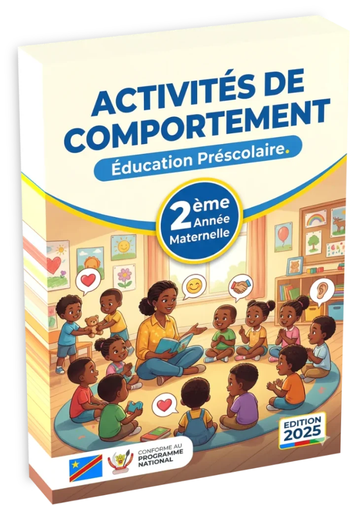 0.1. Note pédagogique à l’enseignant Ce manuel constitue le socle didactique pour la mise en œuvre du domaine d’apprentissage « Activités de comportement » en deuxième année maternelle, conformément au Programme National de l’Enseignement Maternel (PNEM 2021). Il structure l’éducation aux valeurs morales, civiques et spirituelles, essentielles à la socialisation de l’enfant de quatre ans. L’éducateur trouvera ici une progression thématique rigoureuse visant à transformer l’égocentrisme naturel de l’enfant en une ouverture harmonieuse vers l’autre et la communauté. L’approche privilégie le vécu quotidien, l’exemple et la narration pour ancrer les valeurs dans la réalité congolaise.