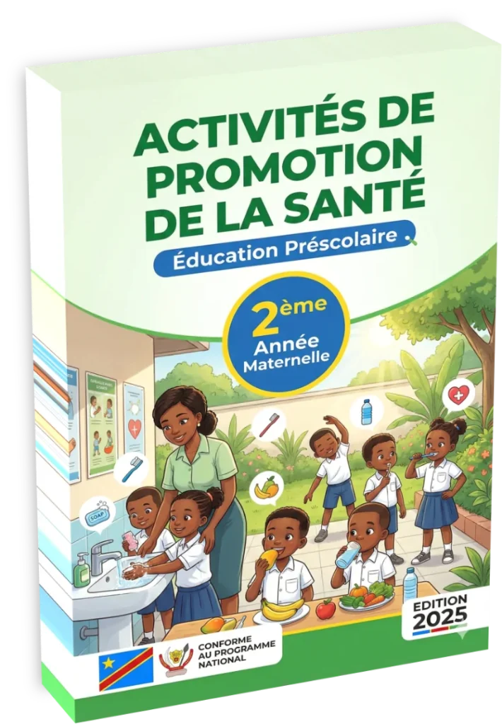 0.1. Note pédagogique à l’enseignant Ce manuel opérationnalise le domaine d’apprentissage « Activités de promotion de la santé » pour la deuxième année maternelle, conformément au Programme National de l’Enseignement Maternel (PNEM 2021). Il s’agit d’un guide pratique destiné à installer des habitudes de vie saines chez l’enfant de quatre ans. L’approche privilégie l’action concrète et la répétition quotidienne des gestes d’hygiène et de sécurité. L’enseignant trouvera ici des séquences structurées pour transformer les concepts abstraits de santé en comportements réflexes, en utilisant les ressources locales disponibles dans les écoles de la République Démocratique du Congo.