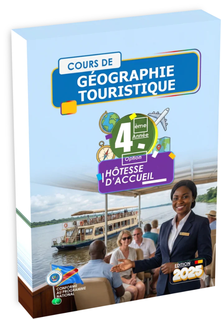 L’enseignement de la Géographie Touristique en quatrième année de l’option Hôtesse d’Accueil vise à doter l’apprenant d’une maîtrise approfondie du potentiel touristique de la République Démocratique du Congo et des grandes destinations internationales. L’objectif consiste à former des professionnelles capables de valoriser le patrimoine national, d’orienter efficacement les visiteurs vers les sites d’intérêt et de fournir des informations précises sur les aspects logistiques, climatiques et culturels des séjours. L’élève doit acquérir la capacité de transformer une connaissance territoriale en argumentaire commercial et en service d’assistance de qualité.
