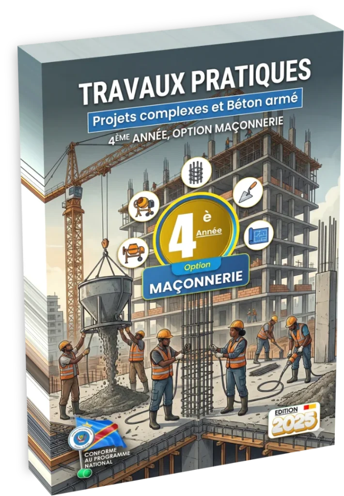 Ce manuel de Travaux Pratiques constitue le pivot de la formation technique en quatrième année de maçonnerie. Il matérialise la transition entre les acquis théoriques et la réalité opérationnelle du chantier. L’enseignant trouvera ici une progression méthodique conçue pour amener l’élève à réaliser des ouvrages complexes en béton armé et en maçonnerie décorative. La pédagogie repose sur la démonstration active suivie d’une exécution supervisée, garantissant l’acquisition de gestes professionnels sûrs et précis, indispensables sur les chantiers de la République Démocratique du Congo.